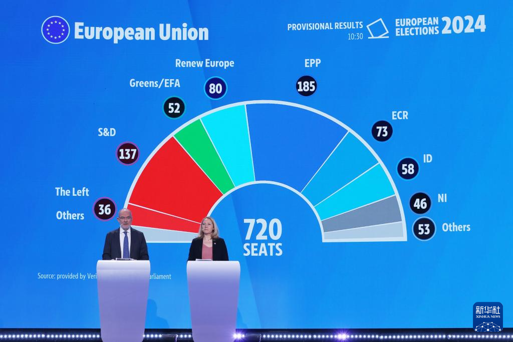 这是2024年6月10日在位于比利时布鲁塞尔的欧洲议会拍摄的选举临时结果★ღღ★ღ。新华社记者 赵丁喆 摄